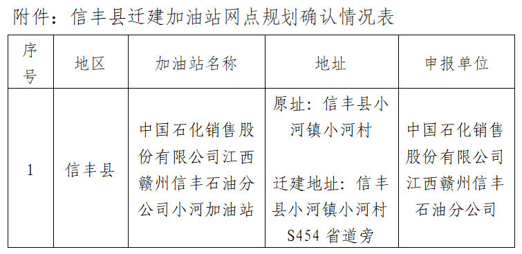 依据《江西省商务厅关于取消和下放石油成品油经营资格审批权限有关事项的通知》、《江西省成品油零售体系“十四五”发展规划的通知》等有关要求,我局对信丰县商务局提交的关于迁建加油站网点规划确认的申请进行了审核,现进行公示,公示期为7个工作日(2025年9月17日至2025年9月25日)。如有异议,请于2025年9月25日前反馈至赣州市行政审批局。